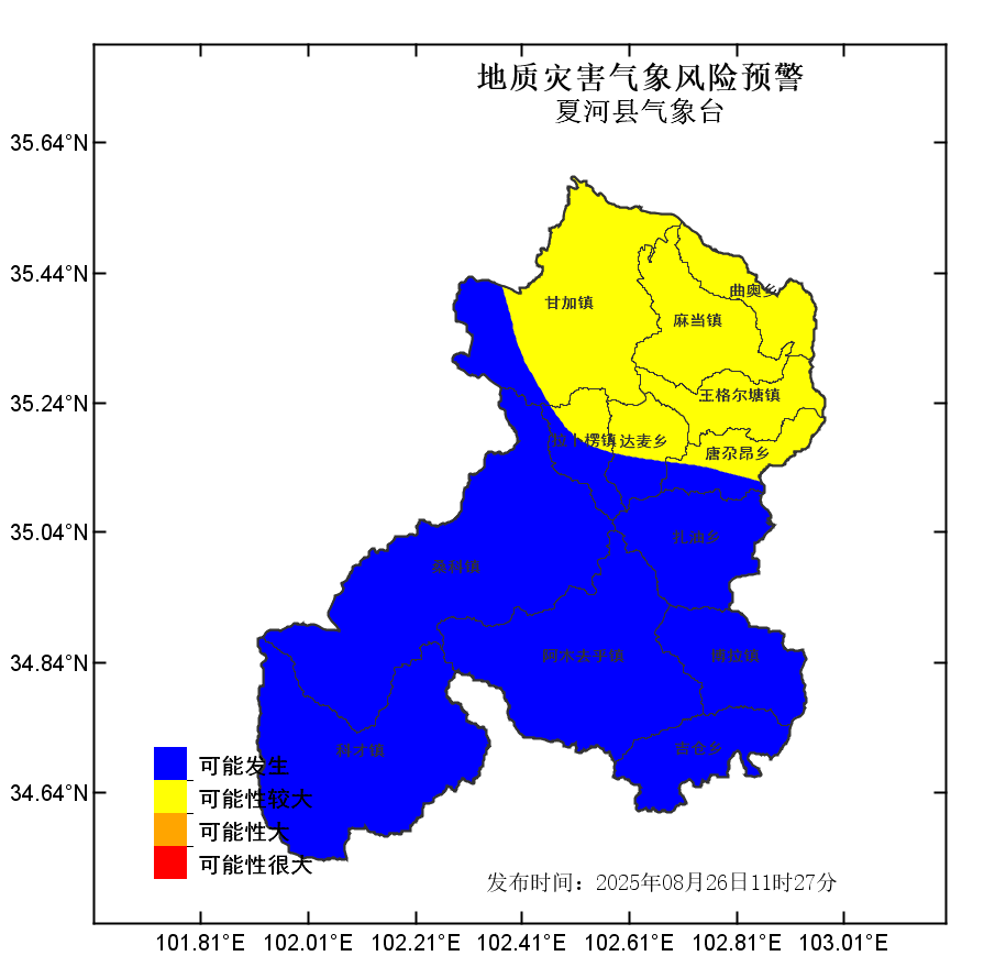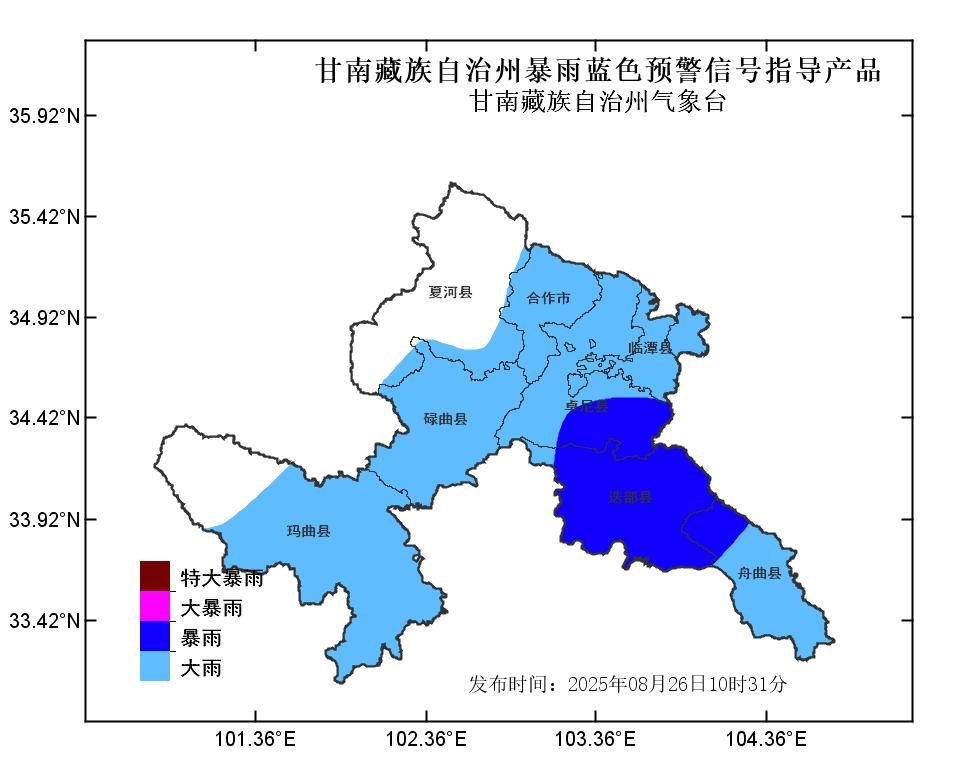 防御措施: 此次过程持续时间长、累计雨量大、并伴有短时强降雨,地质灾害风险较高,各相关部门需高度重视预警响应工作。采取防御措施,提醒灾害易发地点附近的居民、厂矿、学校、企事业单位密切关注天气预报,提前做好地质灾害预防和应急处置准备,以防天气突然恶化。 甘南州灾害性天气通报 甘南州气象台8月26日10时30分发布暴雨蓝色预警:预计未来24小时,我州合作、碌曲、玛曲、临潭部分地方有大雨,卓尼、迭部、舟曲局地有暴雨,并伴有短时强降水、阵性大风,最大小时雨强30~50毫米。请注意防范强降水落区叠加及局地强降水可能引发的中小河流洪水、城乡积涝、山洪、滑坡和泥石流等次生灾害。