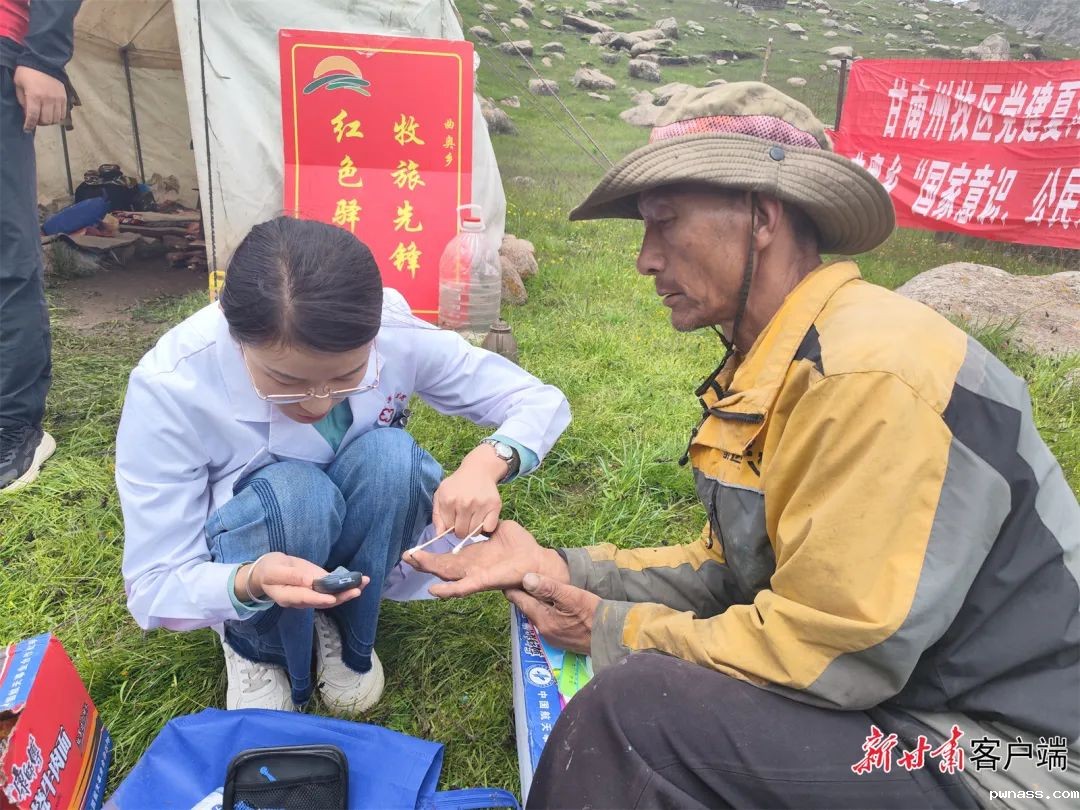帐篷里,服务队迅速展开工作:乡卫生院的医护人员为老人测量血压、检查关节病;包村干部详细了解转场后草场使用、家庭收入等情况。