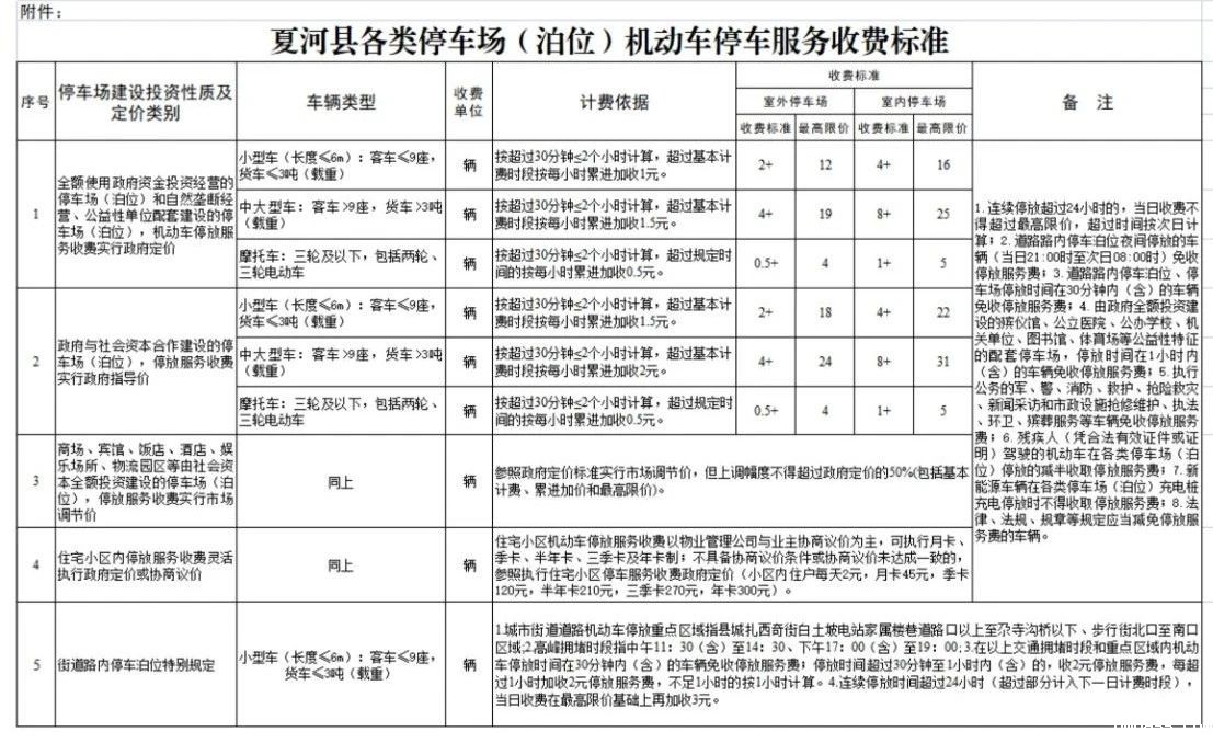 HTH·华体会体育人民政府办公室关于印发《HTH·华体会体育机动车停放服务收费管理实施方案》的通知 各乡镇人民政府,县级国家机关各部门,省州驻夏各单位: 《HTH·华体会体育机动车停放服务收费管理实施方案》已经十九届县政府第28次常务会议审议通过,现印发给你们,请结合各自职责,抓好贯彻落实。 HTH·华体会体育人民政府办公室 2023年5月30日 HTH·华体会体育机动车停放服务收费管理实施方案 第一章 总则 第一条根据《中华人民共和国价格法》《中华人民共和国道路交通安全法》《甘肃省价格管理条例》《甘肃省定价目录(2022版)》等法律、法规和政策要求,为进一步提升全县机动车停放管理水平,建立健全机动车停放部门协调管理机制和服务收费机制,充分发挥价格杠杆调节作用,合理配置泊车资源,减小交通压力,不断提高停车资源利用效率和城市规范化、科学化、精细化管理水平,结合县情实际,制定本方案。 第二条本方案所称“机动车停放服务收费”是指为机动车停放提供场地和管理服务而收取费用的行为。 第三条本县区域内机动车停放服务收费及管理适用本方案。 第四条机动车停放服务收费管理工作在县政府统一领导下,由价格主管、市场监管、公安交警、旅游管理、交通运输、自然资源、城市管理、财政和税务等部门按照各自职责,互相配合进行管理和监督检查。 价格主管部门负责全县机动车停放服务收费政策的制定,依据《甘肃省定价目录(2022版)》规定的定价权限制定机动车停放服务收费标准。 城市管理部门负责停车区域(除旅游景区景点)划分、停车泊位设置、登记备案及宣传引导、运营监管,规范机动车停放服务管理。 公安交警部门负责确定停车场(泊位)类别、等级、车辆类型、僵尸车辆清理、剐蹭事故处理及交通拥堵疏导等工作,对违规停放行为予以处罚。 市场监管部门负责机动车停车场(泊位)经营者营业执照的核准颁发和收费行为的日常监管。 旅游管理部门负责全县旅游景区景点停车区域划分、停车泊位设置、登记备案及机动车停放秩序管理。 自然资源部门负责停车场用地保障供给。 交通运输部门负责改善道路交通状况,保障交通安全畅通。 财政、税务等部门按照各自职责,规范停车场(泊位)收费管理相关工作。 第二章 收费管理形式 第五条机动车停车场(泊位)类型分为室外停车场(含道路路内停车泊位)和室内停车场(泊位)。 (一)室外停车场(泊位)是指在建筑物外设置的停车位,包括经城市管理、公安交警等部门批准占用城市道路非机动车道、人行道等城市设施设置的道路路内机动车停车泊位; (二)室内停车场(泊位)是指在建筑物内设置的,有顶盖遮拦,具备防雨、防晒功能的停车位; (三)道路路内停车泊位,是指在城市、乡镇街道范围内依法施划设置的机动车停车泊位,包括非机动车道停车泊位和人行道停车泊位(含与人行道相连的敞开式停车泊位)。 第六条道路路内停车泊位(包括城市街道、乡镇街道)不施划中型以上客运、货运车辆泊位,在一定区域内应施划残疾人机动车、摩托车及非机动车等专用停车泊位,按右侧顺向停放,不得逆向停放。 第七条机动车停放服务收费管理,应遵循以下原则: (一)坚持市场取向,发挥市场在资源配置中的决定性作用; (二)结合停车资源供需实际,对不同区域、不同设施、不同车型、不同时段停放服务实行差异化收费政策。 第八条根据不同投资主体和经营性质,机动车停放服务收费分别实行政府定价、政府指导价和市场调节价。 (一)全额使用政府资金投资经营的停车场(泊位)和自然垄断经营、公益性单位配套建设的停车场(泊位),机动车停放服务收费实行政府定价,主要包括: 1.道路路内机动车停车泊位; 2.党政机关、企事业单位、公共广场、公园、公立医院、学校、银行、图书馆、博物馆、体育场馆、殡葬服务场所、机场、汽车站、旅游景区景点等具有公益性特征和自然垄断性质的配套停车场(泊位); 3.全额使用政府财政性资金、城市建设投资公司等投资建设的停车场(泊位)。 (二)政府与社会资本合作建设的停车场(泊位),停放服务收费实行政府指导价; (三)商场、宾馆、饭店、酒店、娱乐场所、物流园区等由社会资本全额投资建设的停车场(泊位),停放服务收费实行市场调节价。 实行市场调节价的停车场(泊位)经营管理者制定的收费标准,应当在执行前以适当方式向社会公布,并向价格主管、登记备案、市场监管和税务等相关部门报备。 第九条实行政府定价和政府指导价的停车场(泊位),收费标准由县价格主管部门依法结合本地经济发展水平制定,报县政府批准后执行;实行市场调节价的停车场(泊位),收费标准由经营者根据市场供求和竞争状况自主制定。 第三章 差异化收费管理 第十条机动车停放服务收费标准的制定和调整,应综合考虑投资主体、投资性质、区域位置、经营成本、市场供求、社会承受能力及服务内容、质量等因素,对不同投资、不同设施、不同车型和不同时段停放服务实行差异化收费政策,引导停车资源合理利用。 第十一条根据国家对不同机动车停车场(泊位)的政策导向,合理确定机动车停放服务收费标准。区分资源性质、设施类型,实行路内高于路外、室内高于室外、非住宅停车高于住宅停车等差异收费政策,逐步建立以配建停车为主、路外停车
