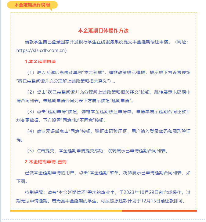各位HTH·华体会体育生源地助学贷款学生: 根据财政部、教育部、人民银行、银保监会《关于做好2023年国家助学贷款免息及本金延期偿还工作的通知》(以下简称《通知》)要求,国家开发银行将对本行承办的国家助学贷款(含生源地信用助学贷款和高校助学贷款,下同)实行免息及本金延期偿还。现将具体事项公告如下: 一、免息及本金延期偿还范围 (一)免息范围2023年及以前年度毕业的借款学生2023年内应偿还的国家助学贷款利息。 (二)本金延期偿还范围经借款学生自主申请,2023年内应偿还的国家助学贷款本金可延期1年偿还。按照有关规定,助学贷款期限最长不超过22年。 二、办理流程 (一)免息流程免息无需借款学生申请,开发银行将按照《通知》有关规定自动免除相关利息。 (二)本金延期偿还申请流程 1.申请渠道。借款学生需登录国家开发银行学生在线系统(以下简称学生在线系统),按照系统提示完成本金延期偿还申请。本金延期偿还申请不可撤销。 2.申请时间。不晚于《国家开发银行生源地信用助学贷款借款合同》或《国家开发银行高校助学贷款借款合同》等文件(以下简称《借款合同》等文件)约定的2023年偿还日前三个工作日。 如借款学生对多笔国家助学贷款的本金申请延期偿还,需一并提出申请。申请时间不晚于《借款合同》等文件约定的2023年偿还日中的最早日期前三个工作日。 3.延期偿还的期限为一年。延期后的偿还日为2024年的同月同日,即2023年偿还日推迟一年后的同月同日。 4.延期偿还的本金及利息。延期偿还本金的利息计算和本息偿还将按照国家有关规定和《借款合同》等文件约定执行,延期贷款不计罚息、不收复利。《通知》免息范围内的利息将予以免除,超出部分由借款学生自行承担。成功申请本金延期偿还的借款学生原2024年(含)及后续年度内应偿还的国家助学贷款本金及利息,仍需按照《借款合同》等文件的约定还款。 5.其他事项。若借款学生未按上述要求提交本金延期偿还申请,或因申请不符合国家有关政策规定导致申请不成功的,可按《通知》规定继续享受免息政策,但其余应还款项仍应按照《借款合同》等文件约定还款。如果因申请本金延期偿还导致延期后的偿还日晚于相应《借款合同》等文件约定的合同到期日,即贷款期限内最后一年的本金偿还日,则合同到期日自动顺延至延期后的偿还日。借款学生应于延期后的偿还日偿还原合同到期日应偿还的本息及相应新增利息。开发银行将按照调整后的贷款安排报送征信信息,若借款学生本年度未申请本金延期偿还并产生了逾期记录,开发银行将按照人民银行有关规定报送征信不良记录。 三、温馨提示 开发银行不会以免息和延期还本为由,附加不合理条件,或要求转账汇款或索取个人信息,如收到此类邮件、电话或短信,请勿轻信,以免蒙受损失。如您有任何疑问,请致电国家开发银行95593或HTH·华体会体育学生资助管理中心0941-7125631服务热线咨询,咨询时间为工作日8:30至17:30。 感谢您长期以来对国家开发银行的信赖与支持! 国家开发银行学生在线系统网址:生源地信用助学贷款:https://sls.cdb.com.cn/