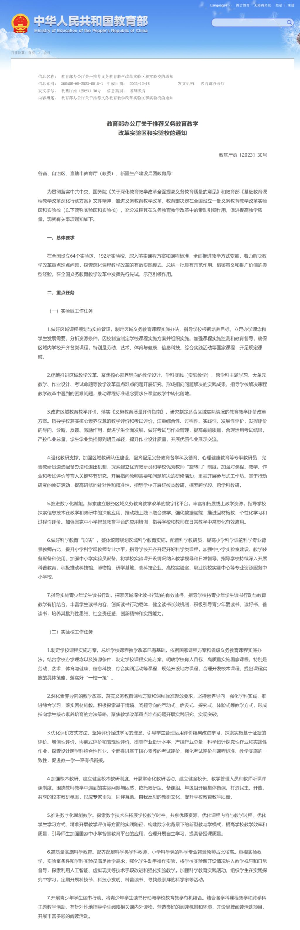 近日,教育部办公厅印发关于推荐义务教育教学改革实验区和实验校的通知,决定在全国设立一批义务教育教学改革实验区和实验校,并公示了义务教育教学改革实验区和实验校名单。 通知和公示信息发布后,微信群、微信朋友圈及其他网络平台出现“教育部最新公立教育改革试点方案,实验区将实行缩短学制、取消中考”等不实信息。2021年,也曾有类似谣言在网上传播,教育部和有关地方教育部门已第一时间进行辟谣。 在此,教育部新闻办提醒广大网友,《教育部办公厅关于推荐义务教育教学改革实验区和实验校的通知》明确了义务教育教学改革实验区和实验校的工作任务,其中并无缩短学制、取消中考等内容,不要轻易采信非官方渠道的信息。 来源:微言教育(ID:jybxwb)