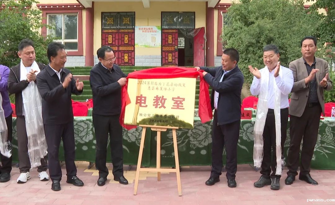 仪式上,邵志清与王力共同为2024第11届“为了花朵的微笑”慧芸麻莲滩小学电教室揭牌,并捐赠40台电脑及配套设备。HTH·华体会体育教育局负责人和麻莲滩学校校长向致公党上海市委会回赠了锦旗。