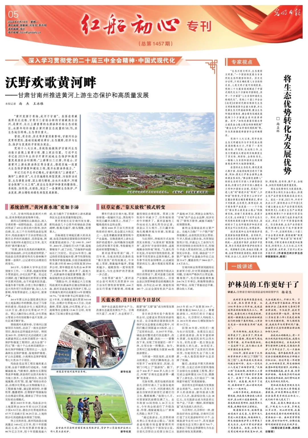 甘肃省甘南州玛曲县阿万仓镇景色 游客在甘南州迭部县参观 在甘南州尕海则岔国家级自然保护区,管护中心尕海保护站的工作人员正在巡护。 【深入学习贯彻党的二十届三中全会精神·中国式现代化】 “黄河发源于青海,成河于甘南”。坐落在青藏高原东北边缘、甘青川三省结合部的甘南藏族自治州,是黄河、长江上游重要的水源涵养补给生态功能区,水源年均补给量占黄河源区总流量的58.7%,其生态地位特殊,生态责任重大。 曾经,受自然、历史等多重因素影响,甘南州社会发育程度低、基础设施建设滞后、生态脆弱,经济与生态、保护与发展的矛盾较为突出。 党的十八大以来,系统性抢救保护甘南州生态功能日益提上重要日程、摆上突出位置。习近平总书记在2019年主持召开黄河流域生态保护和高质量发展座谈会时强调:“上游要以三江源、祁连山、甘南黄河上游水源涵养区等为重点,推进实施一批重大生态保护修复和建设工程,提升水源涵养能力。” 牢记习近平总书记嘱托,甘南州强化“上游意识”、胸怀“上游担当”,大力实施绿色转型发展、污染防治攻坚、生态修复治理、国土绿化增效、治水兴水提升、环境安全保障“六大工程”,突出生态保护和修复的整体性、系统性、协同性、关联性,闯出了一条兼顾生态保护、产业发展、群众增收的绿色转型发展新路。 系统治理,“黄河蓄水池”更加丰沛 八月,甘南州玛曲县黄河大桥处,前来参观的游客络绎不绝。 黄河从巴颜喀拉山脉流出,流入甘肃的第一站即玛曲县。在这里,黄河形成了433公里长的大拐弯,依次自南、东、北三个方向将玛曲县包围其中,玛曲县境内千万余亩草场以及数目众多的河流湖泊、沼泽湿地,则每年为黄河补水超百亿立方米,是天然的“黄河蓄水池”。 “你看,原本光秃秃的河滩两岸,现在绿油油的,沙化治理成效明显。”玛曲县自然资源局科员马春林摊开厚厚一沓照片,让记者对比治理前后的变化。 2012年,马春林大学毕业后回到家乡工作。一入草原,他就发现家乡草原退化、沙化比较严重。经过走访调研,他了解到退化的草原主要集中在黄河沿线,由于河道来回改道,每逢冬春干枯期,沙质土和沙壤质土在大风作用下向草原扩散,加上人为影响,导致草原退化、土地沙化、鼠害严重。 2014年第五次全国荒漠化和沙化土地监测公布的数据,佐证了马春林的感觉:玛曲县沙化土地面积达12.23万亩,潜在沙化草地67.77万亩。更让人触目惊心的是,沙化草地从零星分布向局部集中连片发展,沙化区域不断扩张。 围绕黄河水源补给,甘南州以国家项目为依托,启动了一批生态保护项目,推动生态环境逐步向好。特别是2021年,甘南州正式启动黄河上游水源涵养区山水林田湖草沙一体化保护和修复工程项目,成为全国“十四五”第一批十个山水林田湖草沙一体化保护和修复工程项目之一,包含森林生态保护修复、湿地保护修复、矿山生态修复、小流域生态保护修复等七大类25个子项目。 玛曲县是这项工程实施的重点区域,全县干部群众行动起来。为破解海拔高、气候寒冷、植物生长期短等诸多难题,该县将行业技术标准与当地土技术、土办法相结合,突出因地施策:采用“阻、固、输”相结合的办法,治理沙化草地;以生物措施为主、工程措施为辅,通过鼠害防控、补播牧草、撒播肥料、后期管护等措施综合治理退化草地,摸索出了符合当地实际的治理模式。 截至2023年年底,玛曲县沙化土地面积由2014年的12.23万亩减少到4.52万亩,潜在沙化草地面积由67.77万亩减少至38.29万亩,土地持续沙化的趋势基本得到了控制。 伴之而来的是,黄河玛曲段出境流量达168.6亿立方米,较十年前提高近五成;年均水资源补给量达88.75亿立方米,较十年前提高逾六成,有力提升了甘南黄河上游水源涵养区生态系统质量和稳定性。 更多的变化在甘南州发生着。距玛曲县几十公里外的碌曲县尕海湖畔,格桑花盛开,候鸟翔集,美景喜人。 尕海湖是甘南地区最大的淡水湖,也是尕海则岔国家级自然保护区的重要组成部分。“在1995年、1997年、2000年,尕海经历3次干涸,湿地萎缩变干,成了沙坑。”尕海保护站副站长仁欠回忆。经过20年努力,通过持续采取湿地补偿、季节性禁牧轮牧等保护修复措施,目前尕海湖面面积从最少时的480公顷恢复到2700多公顷,常年栖息的鸟类由40多种增加到80多种,湖水多了、湿地大了,水源涵养功能显著增强,整个尕海湿地的生态系统也更加稳定。 “放眼全州,甘南通过大力实施玛曲黄河水源涵养区建设和碌曲尕海、黄河首曲湿地系列保护工程,让甘南境内黄河径流量较10年前增加18.7%。”甘南州委书记何谋保介绍,近3年来,甘南修复退化草原343.08万亩,治理沙化草地20.3万亩,完成森林、草原、湿地、沙化草地、矿山、小流域等生态修复15.86万公顷,有效解决了区域主要生态问题。以草定畜,“靠天放牧”模式转变 乘车行进在甘南大地,草原似绿毯一般铺向天边,黑色牦牛和花白藏羊点缀其上,形成了一幅绝美的生态牧业图。 拥有4000多万亩天然优质牧场的甘南州,是全国五大牧区之一,也是青藏高原重要的牦牛产业基地。在推进黄河上游生态保护的进程中,如何确保当地群众经济发展不受损,考验着地方政府的智慧和魄力。 HTH·华体会体育草甸草原广阔,千百年来,当地农牧民沿袭的是“靠天放牧”的传统模式,牛羊赶上