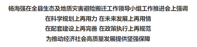 4月12日,HTH·华体会体育召开全县生态及地质灾害避险搬迁工作领导小组第三次会议暨工作推进会议。县委副书记、县长、县生态及地质灾害避险搬迁工作领导小组组长杨海强出席会议并讲话。他强调,要在科学规划上再用力,在未来发展上再用情,在配套建设上再完善,在政策执行上再规范,为推动经济社会高质量发展提供坚强保障。 会议传达学习了全省生态及地质灾害避险搬迁工作领导小组第四次会议暨工作推进会议精神、全州生态及地质灾害避险搬迁领导小组第三次会议暨工作推进会精神、通报了全县生态及地质灾害避险搬迁工作进展情况。 杨海强强调,各级各部门要始终坚持以人民为中心的发展思想,以解决群众急难愁盼问题的务实举措,把问题作为研究制定政策和推进工作的起点,把工作的着力点放在解决最突出的矛盾问题上。要坚持在科学规划上再用力,在未来发展上再用情,在配套建设上再完善,在政策执行上再规范,把搬迁工作作为自己的“责任田”,真正把“最后一公里”转化为“最好一公里”。 杨海强要求,要坚持把生态及地质灾害避险搬迁作为“一把手工程”来抓,压紧靠实各级责任。要严格落实周报告、旬汇总、月通报、季调度、年考核制度,高质量推进各项任务落地落实,切实建立常态考评机制。要结合“三抓三促”行动,全力履职尽责,增强谋划发展的能力、执行落实的能力、开拓创新的能力、服务基层的能力,为巩固拓展脱贫攻坚成果同乡村振兴有效衔接,推动经济社会高质量发展提供坚强保障。 县政府副县长王林平、索南道吉及县生态及地质灾害避险搬迁工作领导小组成员单位和相关乡镇主要负责同志参加会议。